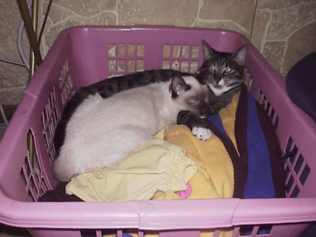 "Bijou", my lynx point siamese baby "Spazz", my boy cat. (Think 'Pet Semetery', hehe)